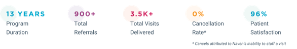 Zero cancellations attributable to Naven across 3,500 visits. A 96% patient satisfaction score sustained year after year. These numbers reflect a strong partnership and operational process to help every patient receive the care they deserve.